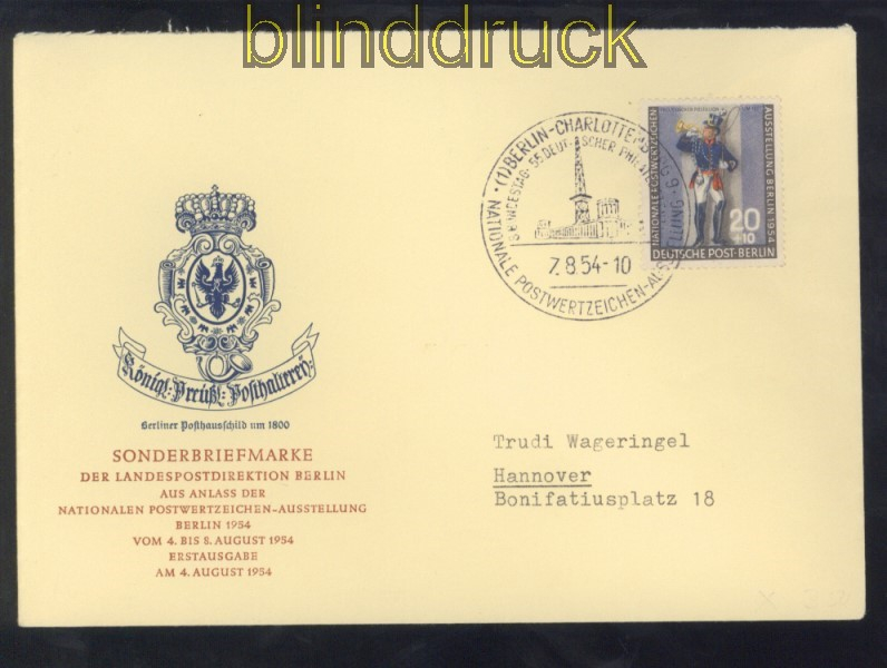 Berlin Mi # 120 portogerecht auf Fernbrief Berlin - Hannover 20 Pfg. Postillon portogerecht auf Fernbrief Berlin-Charlottenburg 7.8.1954 nach Hannover Marke entwertet mit Sonderstempel Nationale Postwertzeichen-Ausstellung 1954 Erhaltung siehe Scan