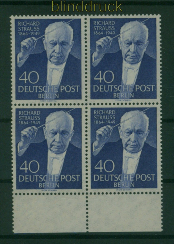 Berlin Mi # 124 postfrischer 4er-Block 5. Todestag Richard Strauss Unterrand 40 Pfg. 5. Todestag Richard Strauss postfrischer 4er-Block vom Unterrand Erhaltung siehe Scan