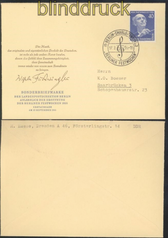 Berlin Mi # 128 FDC Wilhelm Furtwängler 40 Pfg. 1. Todestag von Wilhelm Furtwängler mit Sonderstempel SSt. Berliner Festwochen auf adressierten Schuckumschlag Erhaltung siehe Scan