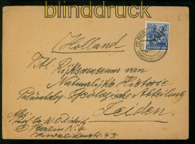 Berlin Mi # Mi # 13 EF auf Auslandsbrief 2.2.1949 nach Leiden in Holland 50 Pfg. Schwarzaufdruck portogerechte Einzelfrankatur EF aus Auslandsbrief gelaufen Berlin NW 40 2.2.1949 nach Leiden in Holland Erhaltung siehe Scan