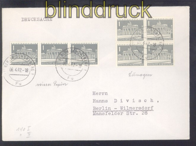 Berlin Mi # 140 x (3) und 140 y (4) MeF Ortsdrucksache Berlin-Schöneberg 1962 1 Pfg. Berliner Stadtbilder (II) 4er-Block mit fluoreszierenden Paier und waagerechter 3er-Streifen normales Papier portogerecht auf Orts-Drucksache Berlin-Schöneberg 6.4.1962 nach Berlin-Wilmersdorf schöne 1 Pfennig Mehrfachfrankatur Erhaltung siehe Scan