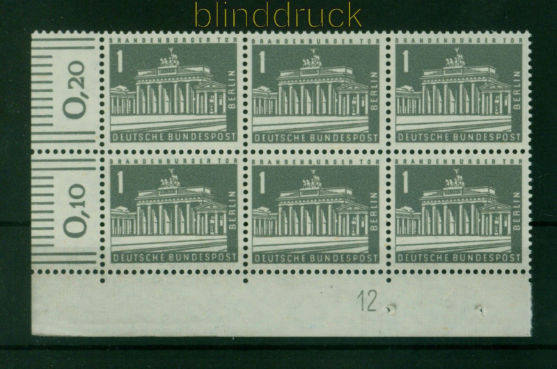 Berlin Mi # 140 y w Druckerzeichen "12" postfrisch im 6er-Block 1 Pfg. Berliner Stadtbilder (II) fluoreszierendes Papier 6er-Block vom Eckrand oben rechts mit Druckerzeichen "12" postfrisch Erhaltung siehe Scan