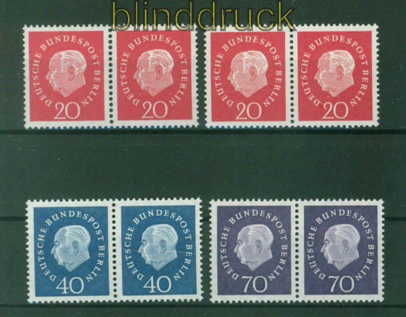 Berlin Mi # 184 v und w, 185 und 186 postfrisch Heuss Medaillon waagerechte Paare 20 bis 70 Pfg. Heuss Medaillon 20 Pfennig mit beiden Gummivarianten in postfrischen waagerechten Paaren Erhaltung siehe Scan