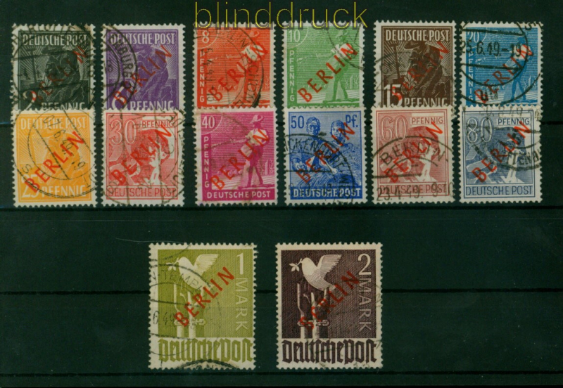 Berlin Mi # 21/34 Rotaufdruck gestempelt Rotaufdruck komplette Ausgabe gestempelt die 25 Pfg., 1 Mark und 2 Mark sind geprüft Schlegel BPP Katalogwert: 900,00 Euro Erhaltung siehe Scan