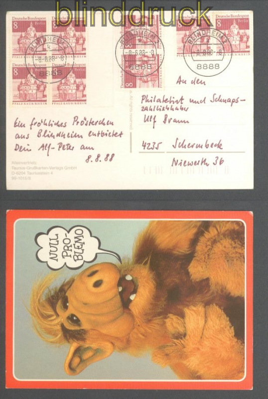 Berlin Mi # 271 4er-Block und 2 Paare Blindheim 8.8.88 Postkarte 8 Pfg. Große Bauwerke als 4er-Block und zwei waagerechte Paare auf Postkarte aus 8888 Blindheim 8.8.88 8 Uhr nach Schermbeck Erhaltung siehe Scan