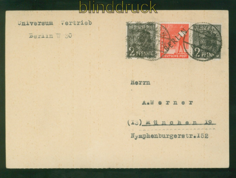 Berlin Mi # 3, SBZ # 182 und Bi-Zone # 36 II MiF Postkarte Berlin 11.9.1948 nach München 8 Pfennig Schwarzaufdruck mit 2 Pfennig SBZ sowie Bi-Zone 2 Pfennig Netzaufdruck schöne Mischfrankatur von drei Gebieten auf Postkarte aus Berlin 11.9.1948 nach München Rückseite nicht beschrieben Erhaltung siehe Scan