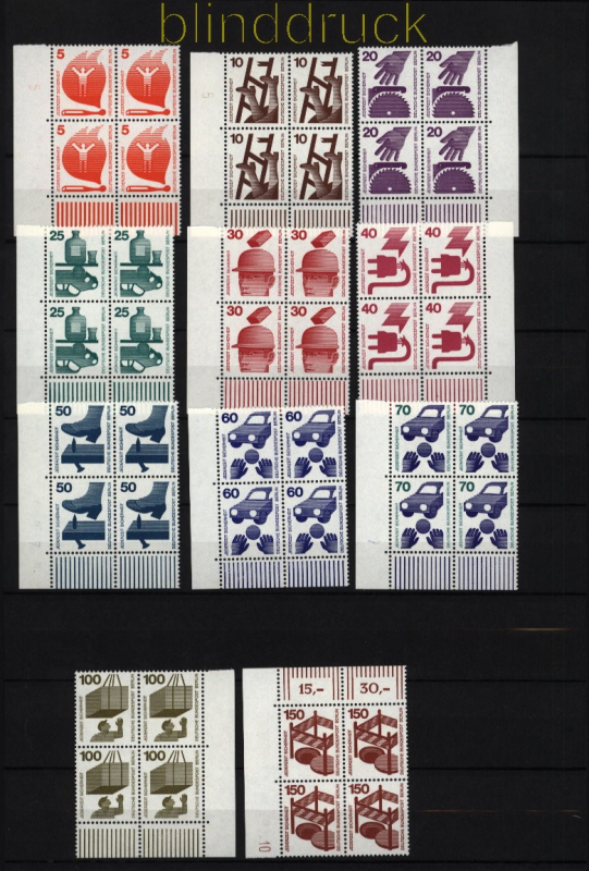 Berlin Mi # 402/11 und 453 postfrisch Unfallverhütung 4er-Blöcke vom Eckrand Freimarken: Unfallverhütung komplette Ausgabe 4er-Blöcke vom Eckrand Mi # 411 mit Druckerzeichen "10" postfrisch nicht gefaltet Erhaltung siehe Scan