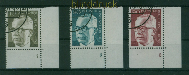 Berlin Mi # 428 FN 1, 430 FN 3 + 433 FN 2 gestempelt Heinemann Formnummern 110, 140 und 190 Pfennig Freimarken: Bundespräsident Gustav Heinemann mit Formnummern gestempelt Erhaltung siehe Scan