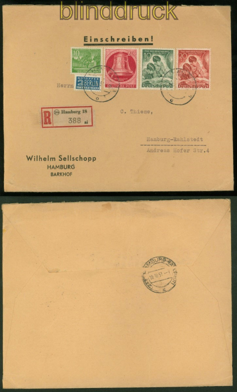 Berlin Mi # 47, 77 und 80/81 auf Orts-R-Brief Hamburg 1951 Tag der Briefmarke 1951 in Mischfrankatur portogerecht auf Orts-R-Brief Hamburg 18.10.1951 Erhaltung siehe Scan