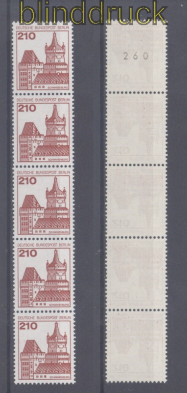 Berlin Mi # 589 R postfrischer 5er-Streifen Burgen & Schlösser 210 Pfg. Freimarken Burgen und Schlösser (II) 5er-Streifen mit Nummer 260 postfrisch Erhaltung siehe Scan