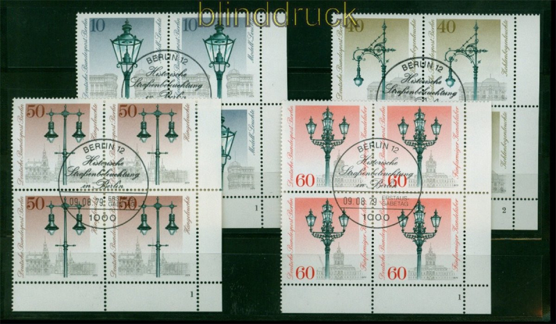 Berlin Mi # 603/06 gestempelte Eckrand-4er-Blöcke mit Formnummern 300 Jahre Strassenbeleuchtung in Berlin komplette Ausgabe Eckrand-4er-Blöcke mit Formnummern Sonderstempel SSt. Erhaltung siehe Scan