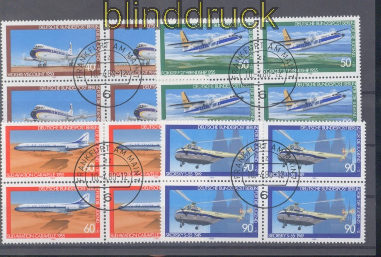 Berlin Mi # 617/20 gestempelte 4er-Blöcke Jugend 1980 Flugzeuge (50346)