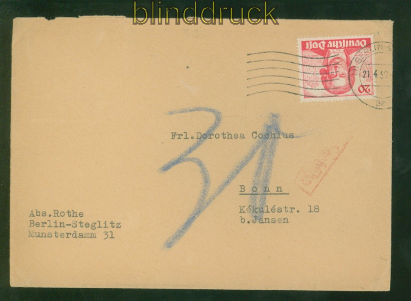 Berlin Mi # 62 EF Fernbrief Berlin-Steglitz 21.4.1950 nach Bonn Nachgebühr 20 Pfg. Goethe als Einzelfrankatur da wohl über 20 Gramm Gewicht mit 30 Pfennig Nachporto belegt auf Fernbrief aus Berlin-Steglitz 21.4.1950 nach Bonn rückseitige Öffnungsmänegl wieder vertklebt Erhaltung siehe Scan
