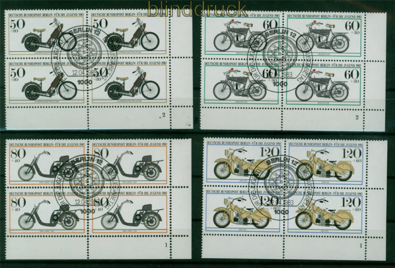 Berlin Mi # 694/97 gestempelte Eckrand-4er-Blöcke mit Formnummern Jugend 1983: Motorräder komplette Ausgabe Eckrand-4er-Blöcke mit Formnummern Sonderstempel SSt. Erhaltung siehe Scan