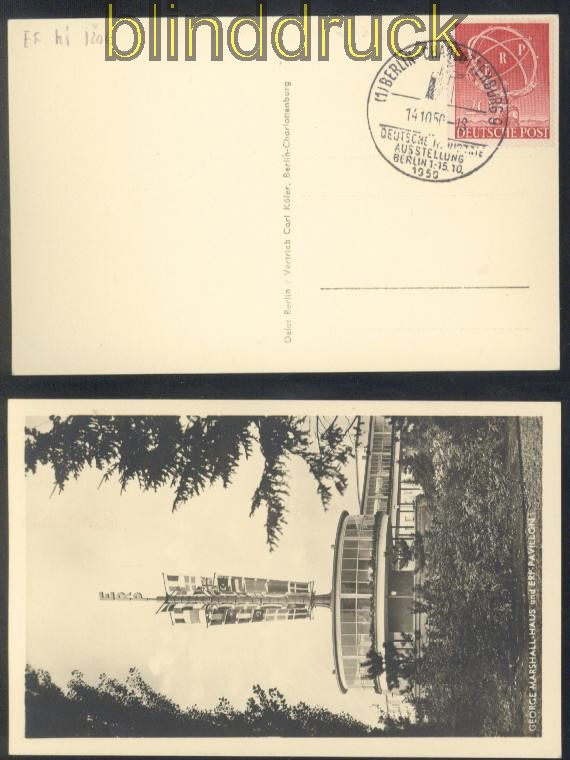 Berlin Mi # 71 EF auf Ausstellungskarte SSt. 14.10.1950 20 Pfg. Deutsche Industrie-Ausstellung ERP Motiv: George Marshall-Haus und ERP Pavillon auf Berlin Mi # 71 EF auf Ausstellungskarte mit Sonderstempel SSt. der Ausstellung vom 14.10.1950 Erhaltung siehe Scan