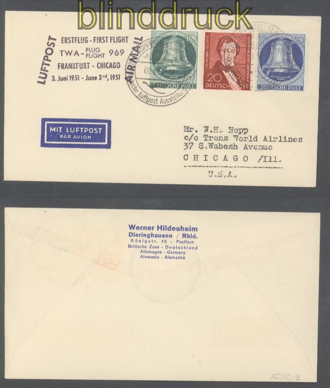 Berlin Mi # 74, 76 und 78 Luftpost-Erstflug Berlin 2.6.1951 20 Pfg. Lortzing mit 10 und 30 Pfg. Glocke Klöppel links auf Luftpost-Erstflugbeleg TWA Flug 969 Frankfurt - Chicago entwertet mit SSt. Wuppertal - Elberfeld Deutsche Luftpost-Ausstellung gelaufen 2.6.1951 nach Chicago Katalogwert für gestempelt: 170,00 Euro Erhaltung siehe Scan