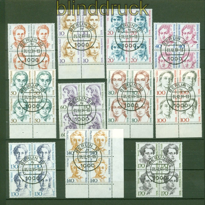 Berlin Mi # 770/849 Frauen komplett in gestempelten 4er-Blöcken Frauen der Deutschen Geschichte komplette Ausgabe in gestempelten 4er-Blöcken vom Eckrand teilweise vom Eckrand mit Formnummern Letzttagstempel Berlin 12 vom 31.12.1991 Erhaltung siehe Scan