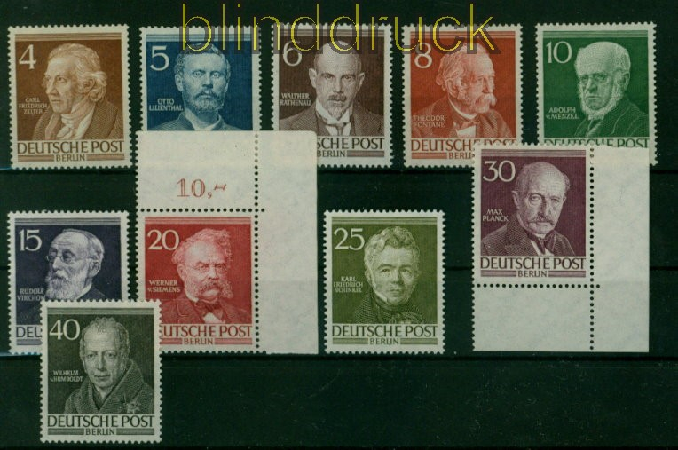 Berlin Mi # 91/100 Männer Berlins postfrisch teilweise Eckrand und teilweise geprüft Schlegel BPP Männer aus der Geschichte Berlins komplette Ausgabe postfrisch 20 Pfg. Eckrand oben rechts und 30 Pfg. Eckrand unten rechts 30 Pfg. geprüft Schlegel BPP Erhaltung siehe Scan