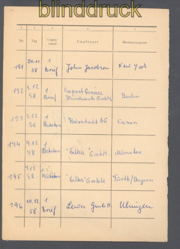 Berlin Seite Posteinlieferungsbuch Mi # 146 Berlin-Friedenau 1958 20 Pfg. Berliner Stadtbilder (II) auf Seite eines Posteinlieferungsbuch aus Berlin Friednau 18.11.1958 die Rückseite wird auch gezeigt, gehört natürlich nicht zu dieser Einlieferungsseite Erhaltung siehe Scan