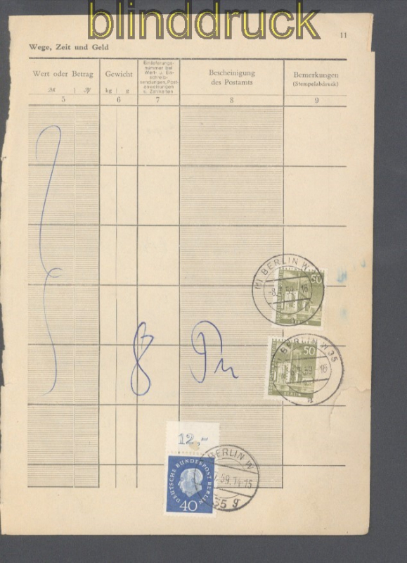 Berlin Seite Posteinlieferungsbuch Mi # 150 (2) und 185 OR Aufgabe Berlin 1959 40 Pfg. Heuss Medaillon vom Oberrand und 50 Pfg. Stadtbilder (II) auf Seite eines Posteinlieferungsbuch 185 OR P auf Brief nicht bewertet gestempelt 80,00 Euro hier eine seltene Verwendung mit Aufgabe in Berlin W 35 die Rückseite wird auch gezeigt, gehört natürlich nicht zu dieser Einlieferungsseite Erhaltung siehe Scan