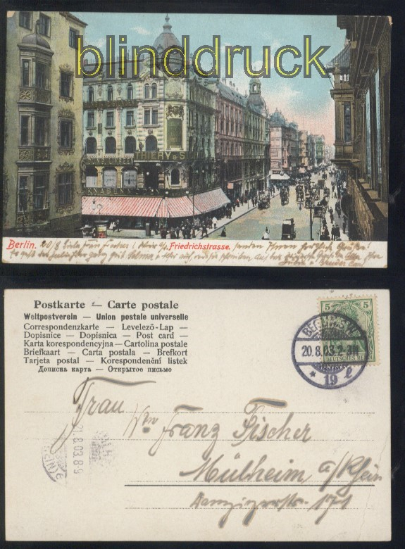 Berlin farb-AK Friedrichstrasse 1903 Karte gelaufen aus Berlin 20.8.1903 nach Mülheim am Rhein Erhaltung siehe Scan