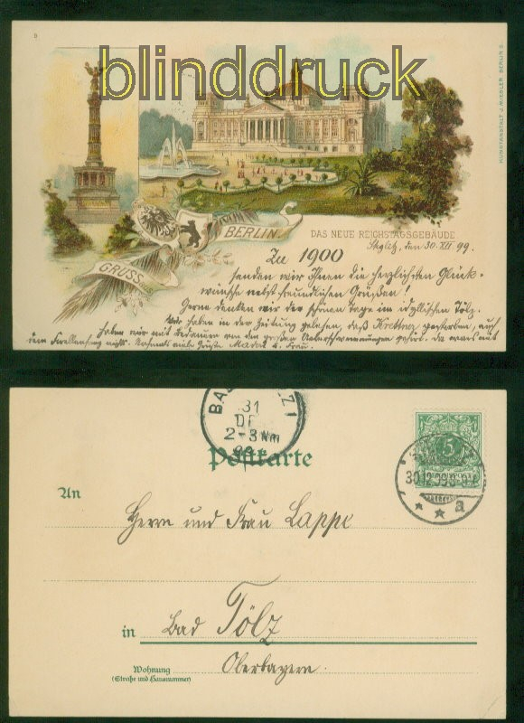 Gruss aus Berlin farb-Litho-AK zwei Ansichten 1899 nach Tölz zwei Ansichten: Siegessäule und das neue Reichstags-Gebäude Karte gelaufen aus Steglitz 30.12.1899 nach Tölz Erhaltung siehe Scan