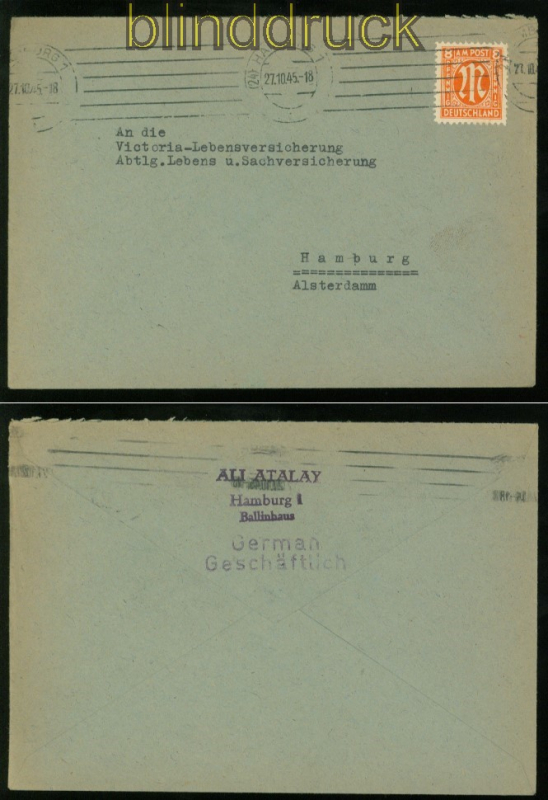 Bi-Zone AM-Post Mi # 21 EF Ortsbrief Hamburg 02.11.1945 (48506)