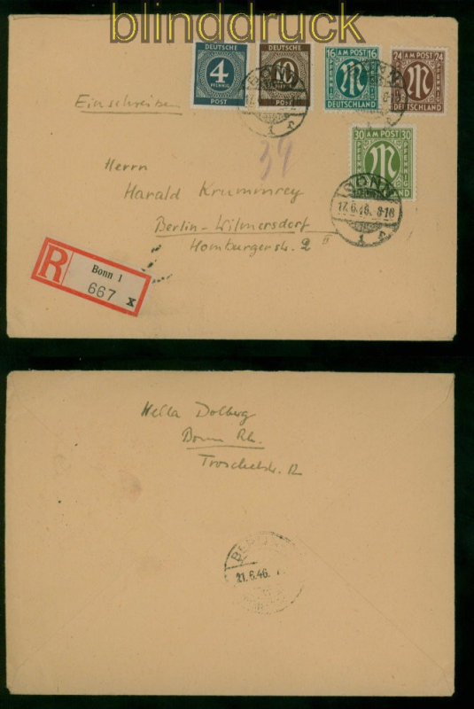 Bi-Zone AM-Post Mi # 25 und 27 in MiF R-Brief Bonn 12.6.1946 nach Berlin AM-Postfrankatur mit Ziffern-Ausgabe I. Kontrollratsausgabe 16 Pfg. und 24 Pfennig deutscher Druck mit Zusatzfrankatur mit 30 Pfennig AM-Post sowie 4 und 10 Pfennig Ziffern portogerechte Mischfrankatur auf Einschreiben gelaufen aus Bonn 12.6.1946 nach Berlin-Wilmersdorf Erhaltung siehe Scan