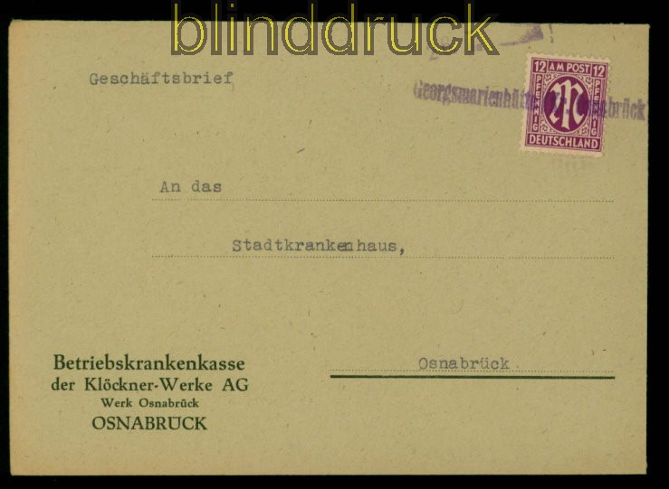 Alliierte Besetzung Bi-Zone AM-Post Mi # 7 EF Fernbrief Notstempel Georgsmarienhütte nach Osnabrück 12 Pfg. AM-Post amerikanischer Druck Einzelfrankatur EF auf Fernbrief entwertet mit Notstempel Georgsmarienhütte und nebengestzten Datumsstempel 26.7. gelaufen nach Osnabrück Erhaltung siehe Scan