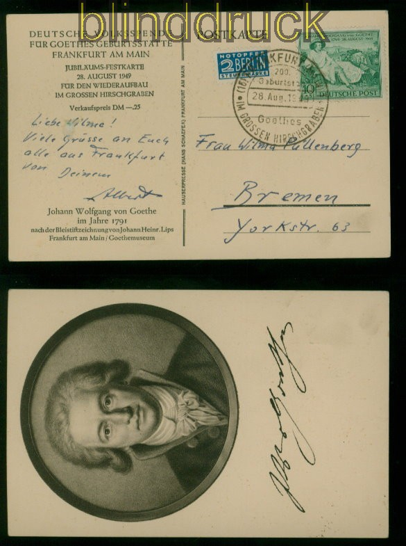 Bi-Zone Mi # 108 EF 10 Pfg. Goethe Volksspende SSt. nach Bremen 10 Pfg. Goethe auf anlaßbezogener Sonderkarte mit Goethe-Porträt Deutsche Volkspende für Goethes Geburtsstätte Frankfurt am Main Jubiläumspostkarte 28.8.1949 für den Wiederaufbau im grossen Hirschgraben entwertet mit Sonderstempel SSt. gelaufen 28.08.1949 nach Bremen Erhaltung siehe Scan