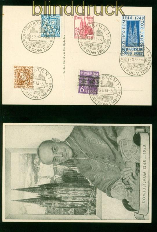 Bi-Zone Mi # 69/72 Kölner Dom Satz-Brief mit Mi # 71 V Sonderstempel 700 Jahre Kölner Dom auf Postkarte zum Domjubiläum mit entsprechendem Sonderstempel aus Köln 24 +16 Pfennig mit dem seltenen Plattenfehler V: Strich rechts am Dach des linken Turms im Michel nicht bewertet gelaufen aus Fulda 21.8.1948 nach Lauterbach Erhaltung siehe Scan