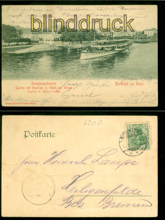 Hessen Biebrich am Rhein sw-AK Dampferhaltestelle Hotel zur Krone 1903 nach Heiligenfelde Dampferhaltestelle Garten mit Pavillon und Hotel zur Krone Karte gelaufen aus Biebrich 12.4.1903 nach Heiligenfelde Ankunftssstempel Erhaltung siehe Scan