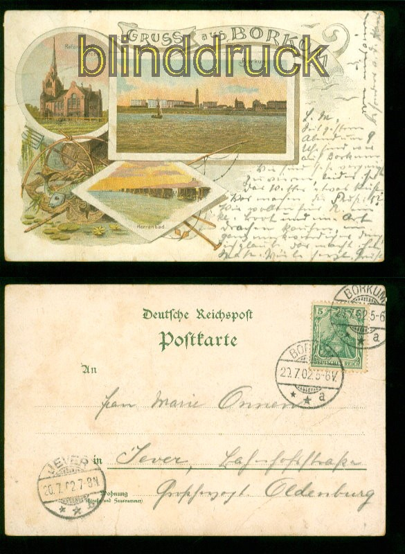 Niedersachsen Gruss aus Borkum Litho-AK drei Ansichten 1902 nach Jever drei Ansichten: Borkum, Herrenbad und reformierte Kirche