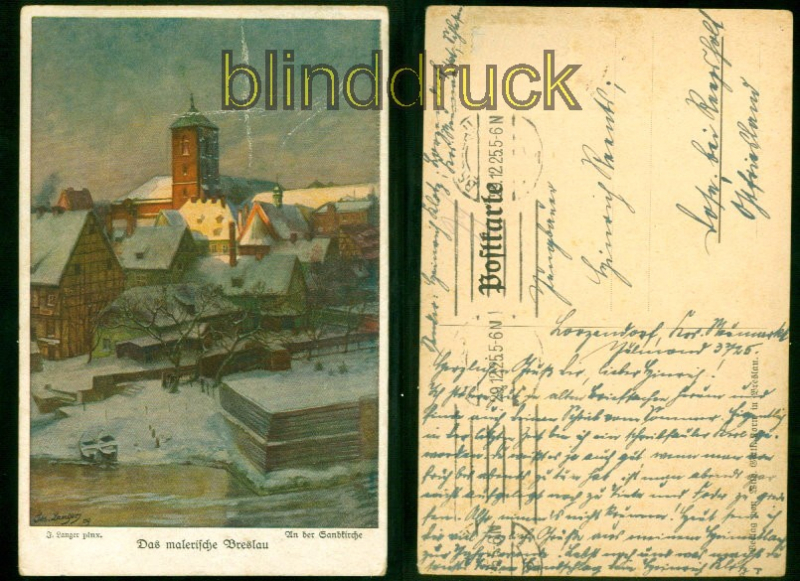 Schlesien Breslau farb-AK Das malerische Breslau 1925 nach Ostfriesland An der Sandkirche Karte gelaufen aus Breslau 29.12.1925 nach Ostfriesland Marke entfernt Erhaltung siehe Scan