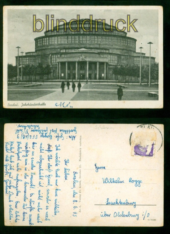 Schlesien Breslau sw-AK Jahrhunderthalle 1943 nach Leuchtenburg Karte gelaufen aus Breslau 8.5.1943 nach Leuchtenburg Absender aus eine Schülerkompanie Marke entfernt Erhaltung siehe Scan
