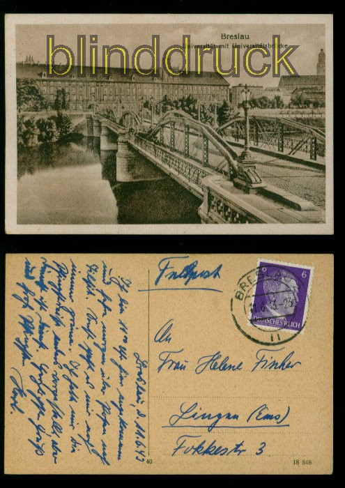 Breslau sw-AK Universität mit Universitätsbrücke 1943 nach Lingen (Ems) (d9930)
