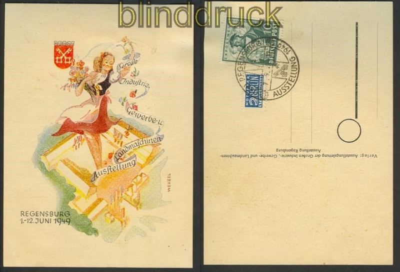 Alliierte Besetzung Bi-Zone Regensburg Große Industrie- Gewerbe- und Landmaschinenausstellung 1.-12.06.1949 Blankogestempelt mit Sonderstempel SSt. Notopfermarke gute Erhaltung siehe Scan