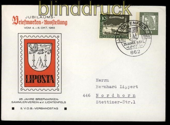 Berlin Privat-Umschlag PU 29/8 LIPOSTA Lichtenfels 1963 SSt. Privat-Ganzsachenumschlag Jubiläums-Briefmarkensausstellung 20 Jahre Briefmarkensammler-Verein Lichtenfels Zufrankatur mit entsprechenden Sonderstempel SSt. Erhaltung siehe Scan