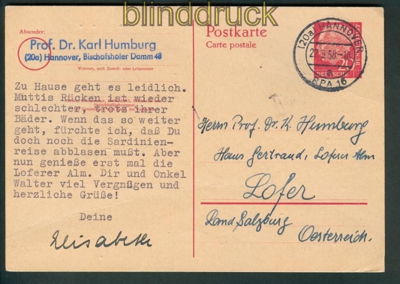 Bundesrepublik Ganzsachenkarte GSK P 20 gebraucht 20 Pfg. Heuss Ganzsachenkarte Auslands-GSK bedarfsmäßig verwendet aus Hannover 22.3.1958 nach Lafer in Österreich Erhaltung siehe Scan