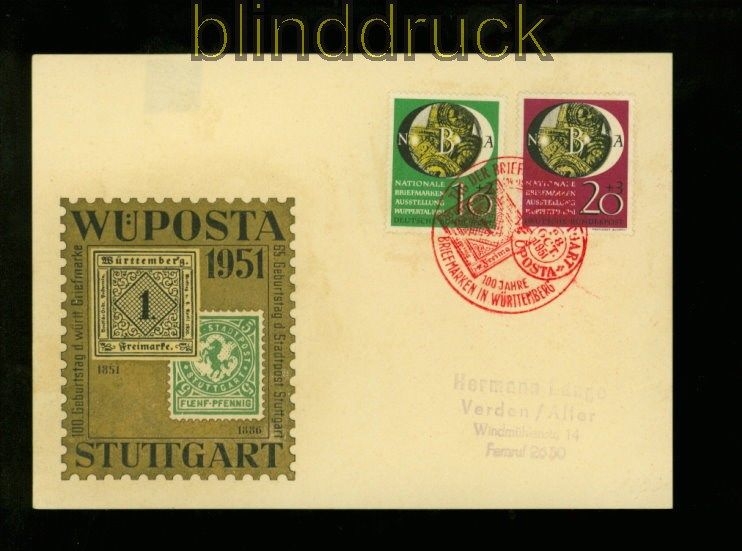 Bundesrepublik Mi # 141/42 auf Schmuckkarte WÜPOSTA Stuttgart 1951 Naposta 1951 komplette Ausgabe auf Schmuckkarte anläßlich der WÜPOSTA Stuttgart 1951 mit Sonderstempel in rot: Tag der Briefmarke 100 Jahre Briefmarken in Württemberg Rückseite nicht beschrieben zwei Falzflecke Erhaltung siehe Scan