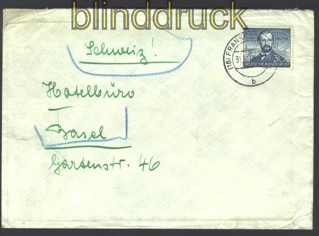 Bund Mi # 15075 Jahre Otto-Motor portogerechte Einzelfrankatur EF auf Auslandsbrief aus Frankfurt 31.10.1952 nach Basel in die Schweiz leichte Spuren Erhaltung siehe Scan