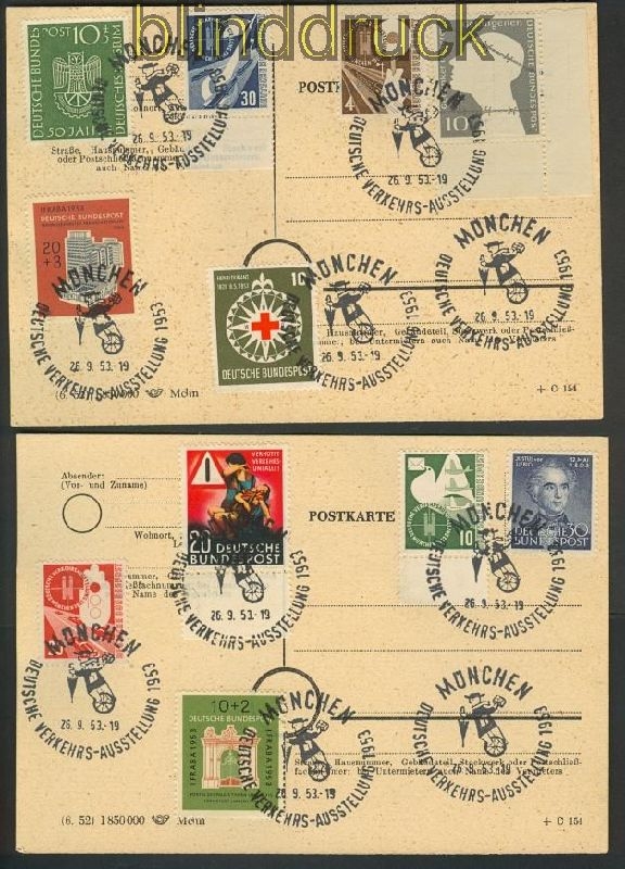 Bundesrepublik Mi # 163, 164, 166, 167/70 und Mi # 171/72 auf 2 VorlagekartenMarken entwertet mit Sonderstempel DVA Deutsche VerkehrsausstellungKatalogwert für gestempelt 199,00 Euro Erhaltung siehe Scan