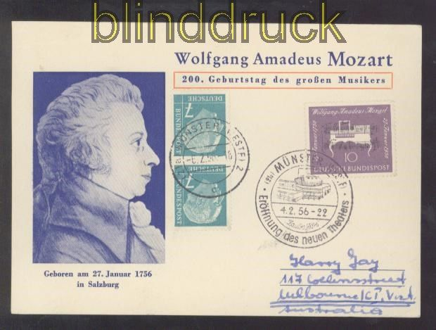 Bundesrepublik Mozart Sonderpostkarte zum 200. Geburtstag Sonderstempel SSt. Mi # 228 200 Geburtstag von Wolfgang Amadeus Mozart mit Zusatzfrankatur auf Sonderpostkarte zum 200. Geburtstag mit Sonderstempel SSt. Eröffnung des neuen Theater 4.2.1956 Zauberflöte Karte gelaufen nach Melbourne in Australien Erhaltung siehe Scan