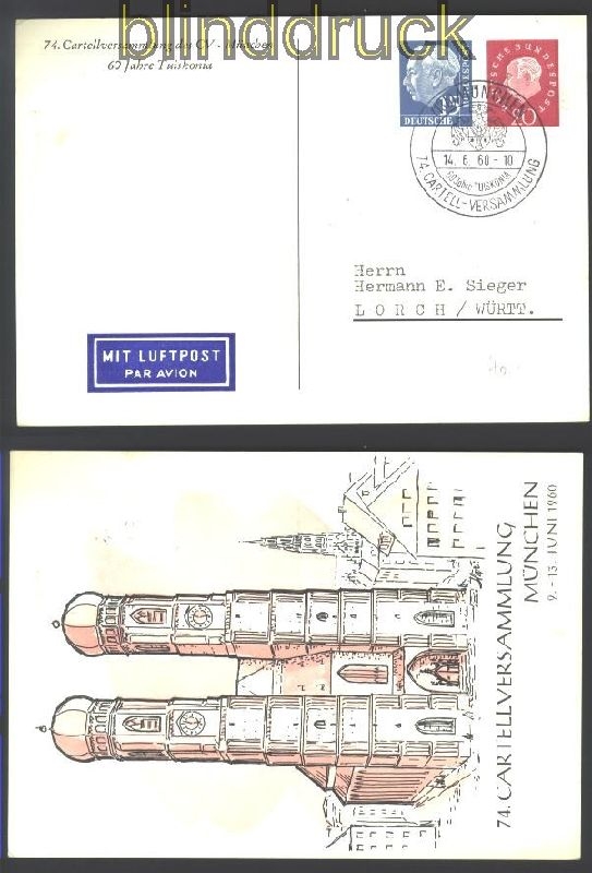 BundesrepublikPrivatganzsachenkarte PP 16/1 74. Cartellversammlung des VC - München 60 Jahre Tuiskonia Luftpost-GSK mit entsprechendem Sonderstempel gute Erhaltung siehe Scan