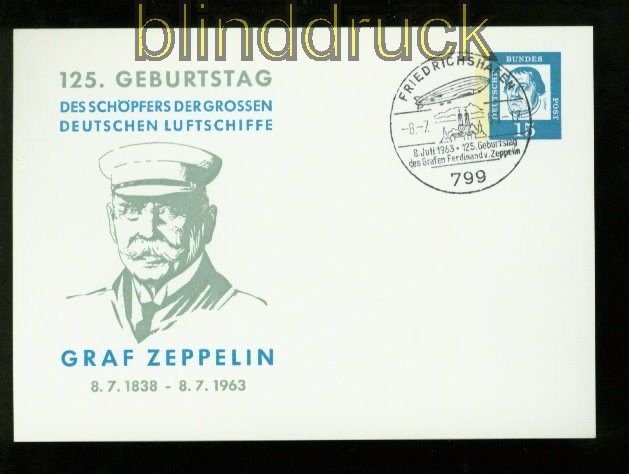 Bundesrepublik Privat-Postkarte PP 29/7 SSt. Zeppelin 1963 15 Pfg. Bedeutende Deutsche Privatpostkarte 125. Geburtstag von Graf Zeppelin mit Sonderstempel Friedrichshafen 1963 Erhaltung siehe Scan