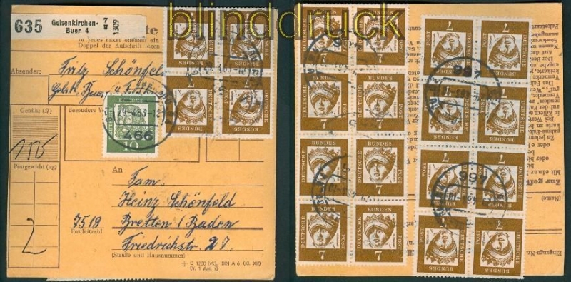 Bundesrepublik Mi # 348 x in Einheiten auf Paketkarte 7 Pfg. Bedeutende Deutschen fluoreszierendes Papier in Einheiten mit Zusatzfrankatur auf Paketkarte: 10 waagerechte Paare in 2 x 8er-Blöcken und einem 4er-Block Paketkarte gelaufen aus Gelsenkirchen-Buer 29.4.1963 nach Bretten gestempelt Erhaltung siehe Scan