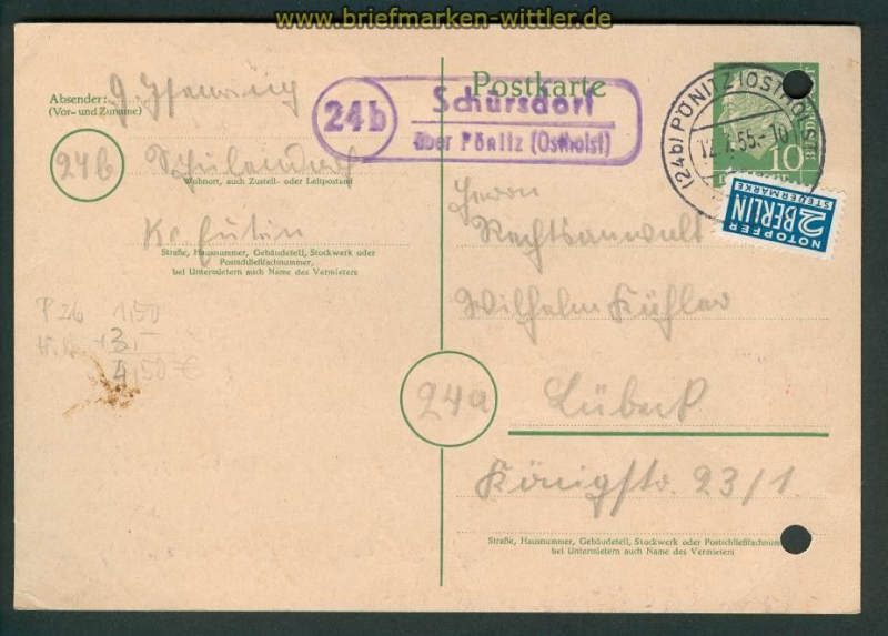 Bundesrepublik Landpoststempel Schürsdorf über Pönitz (Ostholstein) 1958 auf gelochter Postkarte Pönitz 12.7.1955 nach Lübeck Erhaltung siehe Scan