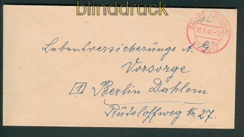 Alliierte Besetzung Schmölln Gebühr bezahlt 16.8.1945 K1 rot Gebühr bezahlt auf Brief aus Schmölln in Thüringen 16.8.1945 nach Berlin-Dahlem Erhaltung siehe Scan