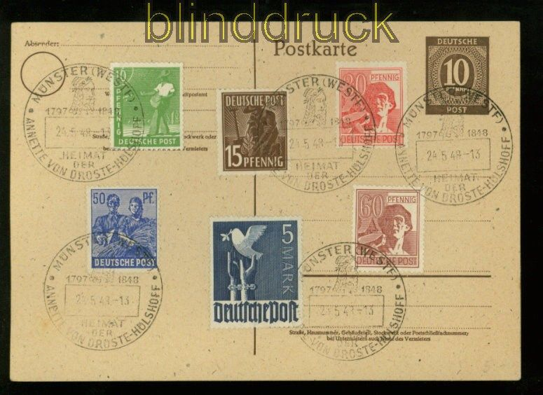 Alliierte Besetzung Gemeinschaftsausgabe Mi # 962 Sonderstempel Alliierte Besetzung Gemeinschaftsausgaben 5 RM Taube mit weiteren Werten auf Vorlagepostkarte mit Sonderstempel Münster 24.5.1948 Annette von Droste Hülshoff Erhaltung siehe Scan