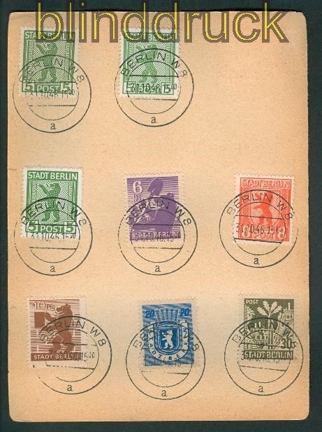 Sowjetische Besatzungszone SBZ Mi # 1/7 A mit 1 AB XIII auf Satz-Karte vom Letzttag Freimarken Berliner Bär und Eiche komplette Aussgabe auf Satz-Postkarte vom Letzttag Mi # 1 mit Plattenfehler AB XIII: Farbstrich oben im Abstrich des ersten T in Stadt jede Marke sauber entwertet am Letzttag Berlin W8 31.10.1946 adressiert nach Hamburg Erhaltung siehe Scan